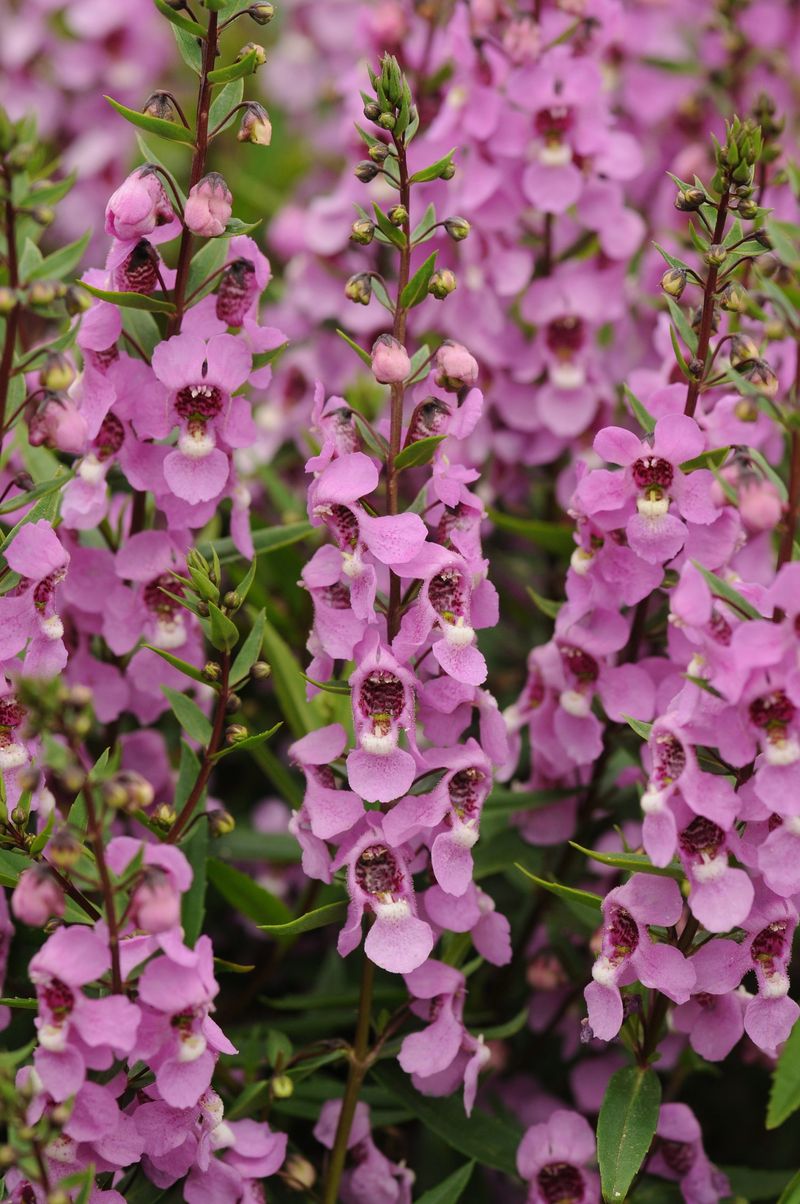 Angelonia, often called summer snapdragon, thrives in hot, sunny conditions. Its spikes of colorful flowers bring vertical interest and charm to garden beds.