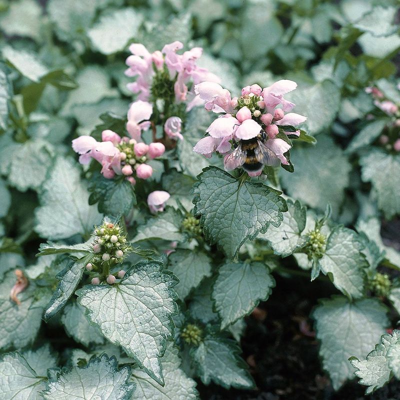 Lamium maculatum ‘Pink Pewter’ creates a soft, silver-tinted carpet with its patterned leaves and gentle pink blooms. This ground cover thrives in shady areas, spreading its charm without overwhelming other plantings.