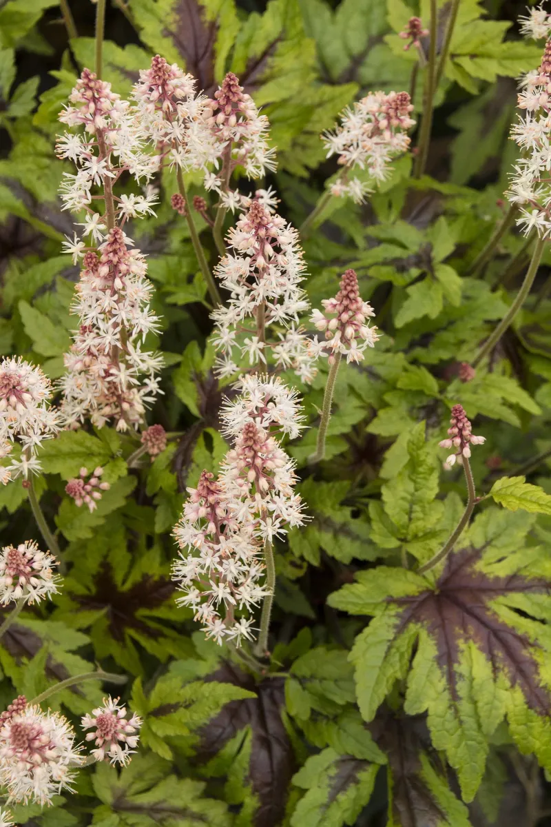Tiarella ‘Sugar and Spice’ offers a delightful burst of frothy white blooms each spring. This perennial’s deeply lobed leaves create a textured backdrop that highlights its striking flowers.