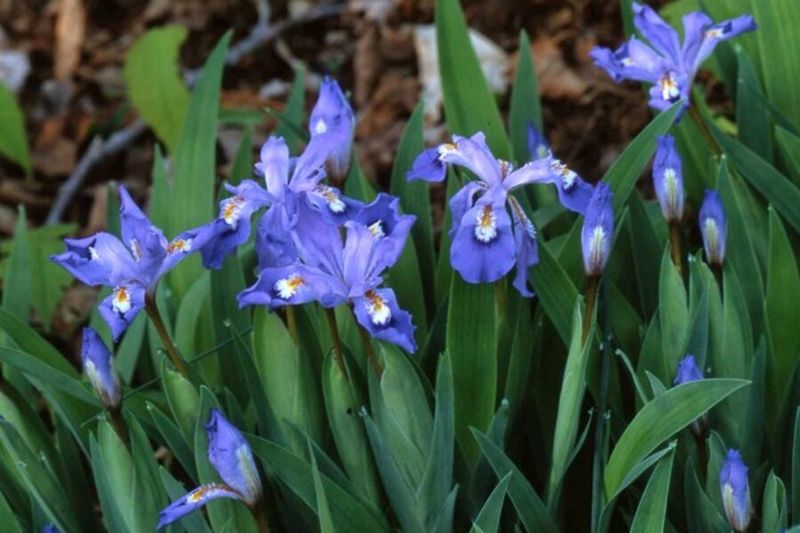 Iris cristata, known as the Dwarf Crested Iris, features delicate blue flowers that emerge in spring. Its petite size and vibrant blooms make it a charming addition to shaded gardens.