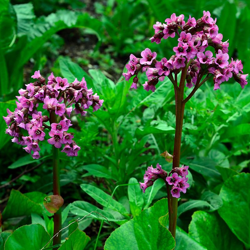 Bergenia ‘Bressingham Ruby’ dazzles with its ruby-red flowers and glossy, evergreen leaves. As one of the first perennials to bloom in spring, it brings color to shaded areas when few others do.