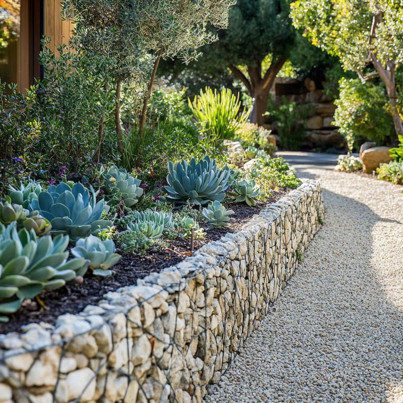 Gabion wall edging offers a rugged and natural look, utilizing wire cages filled with stones. This edging is highly durable and adaptable to various landscape designs. Gabions can be stacked or arranged in different configurations to suit any garden layout.