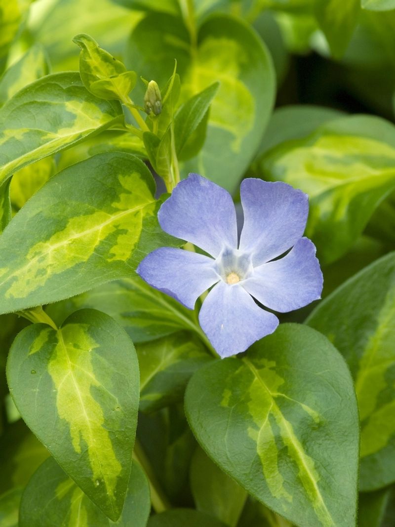 Vinca Major ‘Blue and Gold’ offers a striking combination with its blue flowers and gold-variegated leaves.