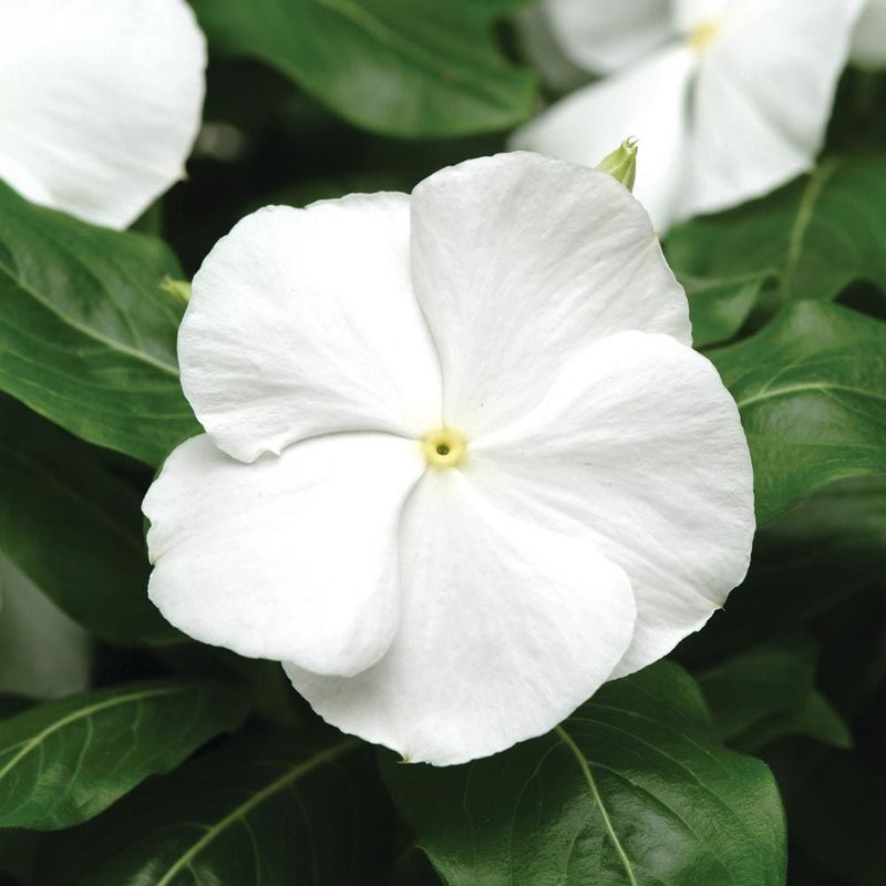 Catharanthus Roseus ‘Titan White’ captivates with its pure white blooms, contrasting beautifully with dark green leaves.