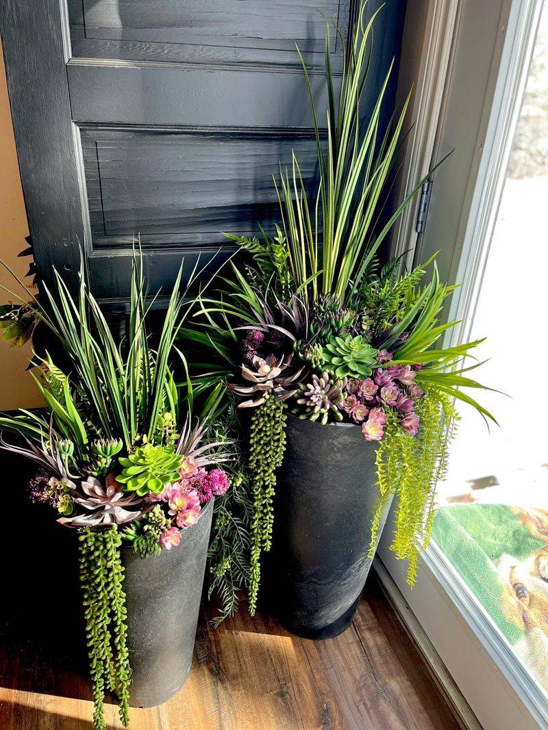 For lovers of clean lines and simplicity, this modern minimalist arrangement offers a breath of fresh air. Picture monochrome pots filled with succulents and ornamental grasses, creating a sleek, contemporary look.