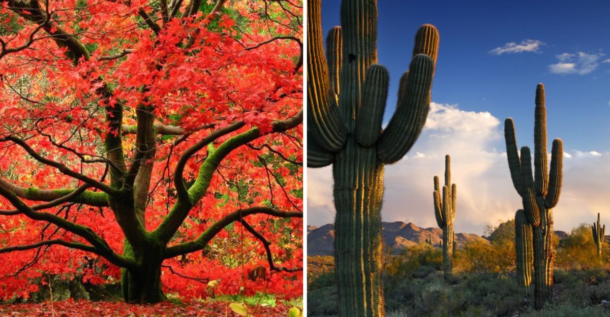 Japanese Maple, known for its delicate, lacy leaves, transforms gardens with its vibrant colors. In autumn, its foliage turns a fiery red, creating a breathtaking spectacle.