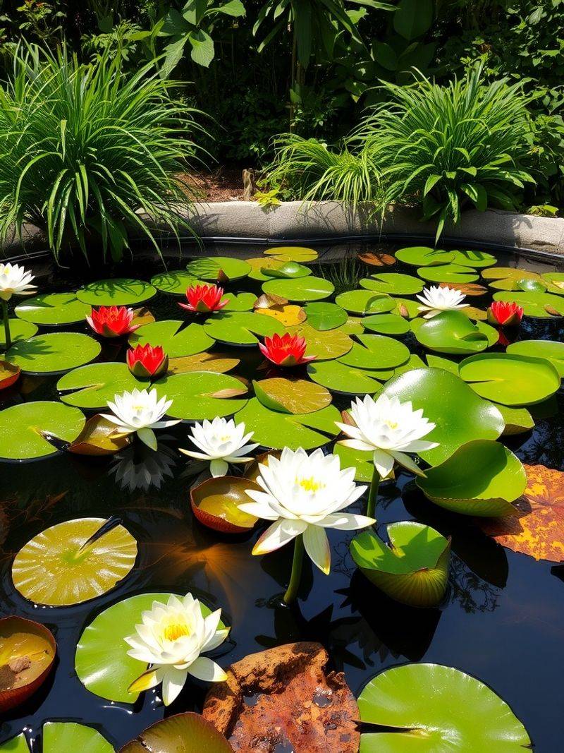 Surrounded by lush greenery, the pond becomes a focal point of peace and beauty, drawing one in for moments of reflection. Water lilies, with their stunning blooms, add a touch of color and elegance to this serene setting.