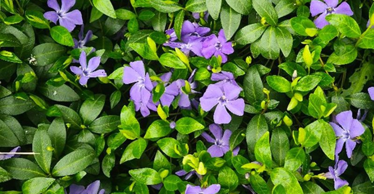 Periwinkle’s glossy, deep green leaves provide year-round appeal, maintaining their vibrancy through the changing seasons. Their evergreen nature ensures that gardens remain lively, even when other plants wither.