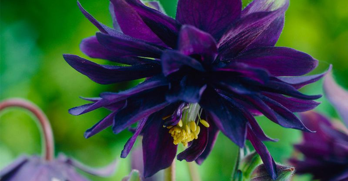 Columbine ‘Black Barlow’ intrigues with its unique, dark double flowers. Known for its delicate beauty, it thrives in partial shade.