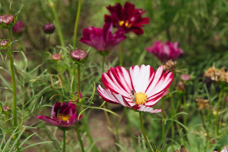 Cosmos, with their delicate petals, are beloved for creating airy gardens but attract thrips. These pests feed on the flowers, causing discoloration and deformation.