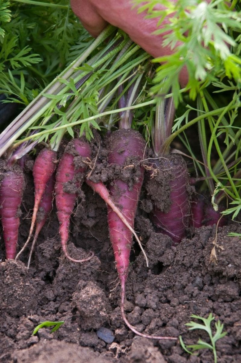 Cosmic Purple carrots are a gardener’s candy. Their deep taproots make them perfect for direct sowing—transplanting is not their style.