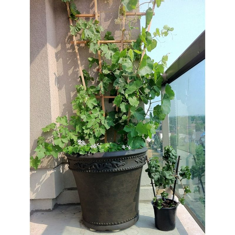 Visualize a grapevine draped over a terrace, laden with dark, juicy grapes. ‘Pinot Meunier’ is a versatile grape for container growing, perfect for winemaking or fresh consumption. Its compact growth habit suits urban environments.