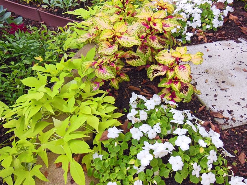 Sweet Potato Vine is known for its bold foliage, available in chartreuse or dark hues, that spills over container edges. This plant offers excellent contrast and a striking visual in garden compositions.