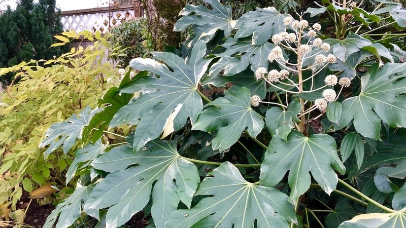 Despite its exotic appearance, fatsia is surprisingly hardy down to about 15°F and thrives in the challenging dry shade beneath trees where few plants prosper. Late autumn brings unusual white flower clusters followed by black berries that persist into winter.