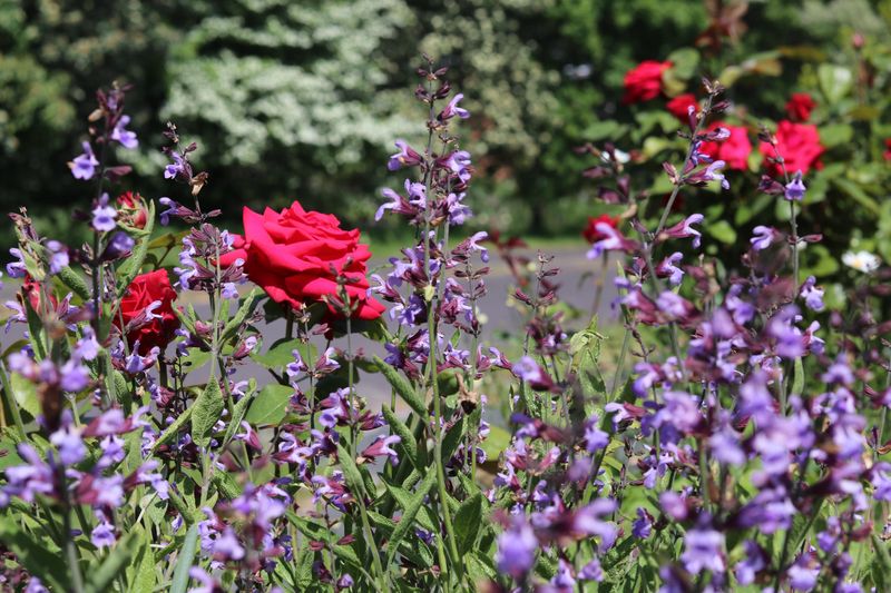 Sage, with its aromatic leaves and subtle flowers, lends a rustic charm to rose gardens. The soft gray-green foliage provides a lovely contrast to vivid rose blooms, enhancing the overall aesthetic.