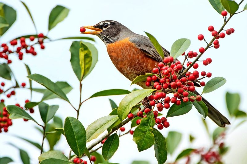 The holly’s evergreen charm never fades, making it a year-round attraction. It’s not just the berries that draw them in; the glossy leaves provide a safe haven for nesting. A brilliant addition to any backyard, hollies are both beautiful and practical.