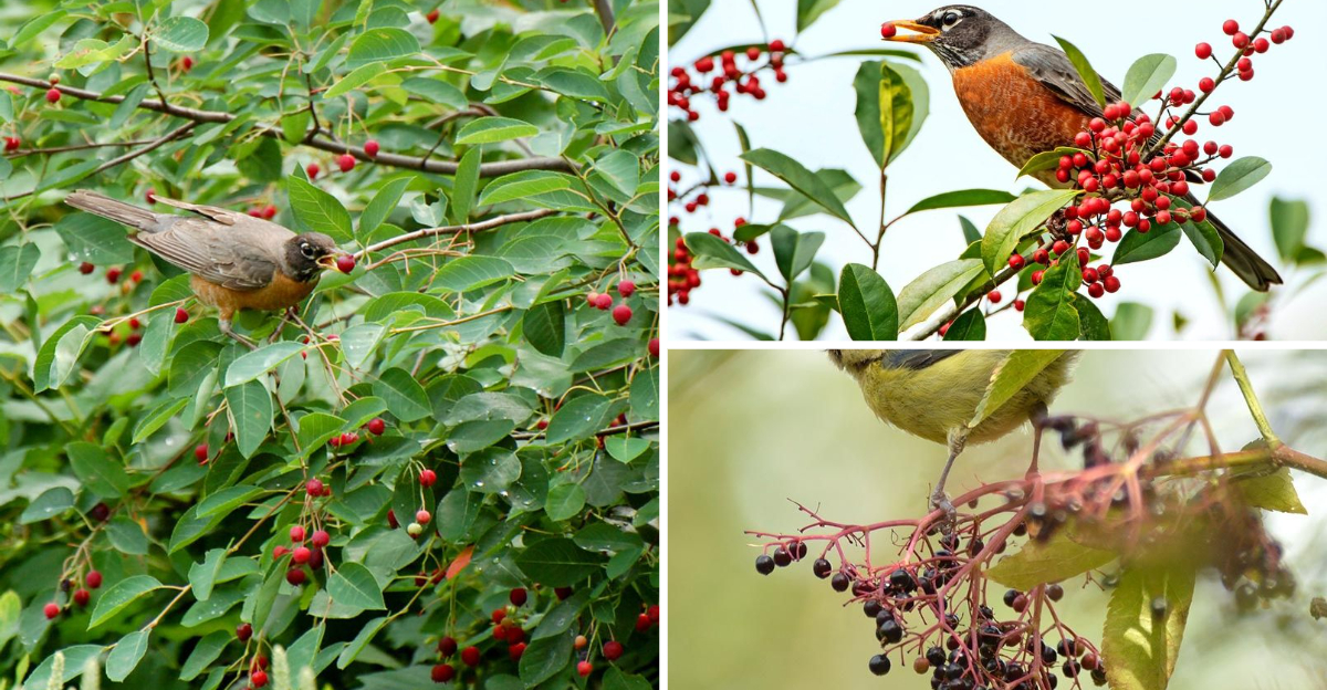 Mountain Ash trees offer clusters of orange berries that are a feast for birds. Their elegant branches create a welcoming scene.
