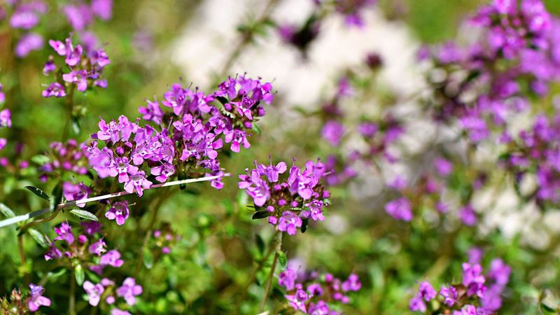 In the sunlit corners of your garden, Wild Thyme thrives with vibrant pink-purple flower clusters. This low-growing groundcover not only beautifies your landscape but also acts as a beacon for bees and butterflies. As they flock to its blooms, the aromatic foliage releases a scent that deters common pests, offering a natural protective shield. This resilient plant needs minimal water to flourish, making it an ideal choice for eco-conscious gardeners. Its modest charm and practical benefits weave seamlessly into any garden.