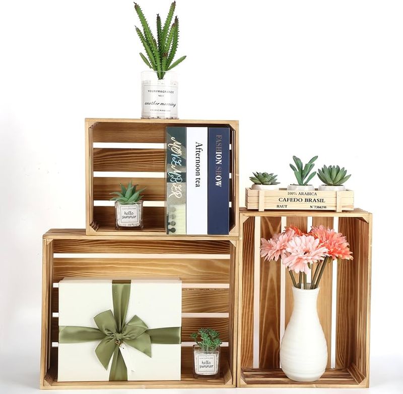 Rustic charm finds its way into your decor with the wooden crate display. Its staggered arrangement offers a creative way to showcase assorted cacti.