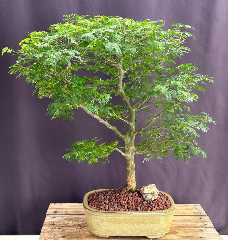 The Brazilian Rain Tree creates instant bonsai drama with feathery compound leaves that fold up at night – a fascinating movement that brings your miniature tree to life. The naturally twisting trunk develops character without wiring, perfect for nature-inspired styling.