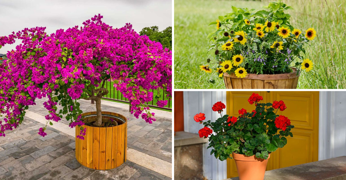 Bougainvillea dazzles with its vivid bracts, transforming ordinary spaces into tropical paradises. This sun-loving beauty thrives in hot climates, making it perfect for containers.